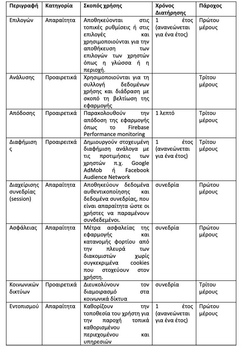 Τα αρχεία αυτά διακρίνονται σε τεχνικά απαραίτητα που διασφαλίζουν ότι διατηρείται η σύνδεση και το περιεχόμενο, που έχει εισάγει ο χρήστης και ότι ο ιστότοπος ή η εφαρμογή θα «θυμούνται» τα στοιχεία του χρήστη και τις προτιμήσεις του καθώς και προαιρετικά που συλλέγουν πληροφορίες αναφορικά με τη διάδραση του χρήστη συμπεριλαμβανομένων των σελίδων που επισκέφτηκε (analytics). Τα αρχεία αυτά επιτρέπουν τη δημιουργία στοχευμένων διαφημίσεων βάσει των ενδιαφερόντων ενός χρήστη και των προηγούμενων επαφών του με τον ιστότοπο/εφαρμογή (advertising cookies), «θυμούνται» τις προτιμήσεις και τις επιλογές του χρήστη προκειμένου να σχεδιάζουν το περιεχόμενο του ιστότοπου ή της εφαρμογής βάσει των αναγκών και προτιμήσεών του (personalization cookies) και επιτρέπουν στους χρήστες να μοιράζονται περιεχόμενο άμεσα στα μέσα κοινωνικής δικτύωσης (social media cookies). Η συγκατάθεση των χρηστών θα ζητείται πριν από την τοποθέτηση των προαιρετικών αρχείων.